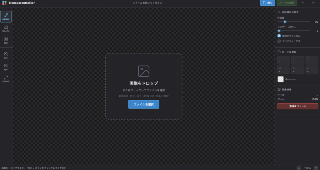 PHP の GD ライブラリを使用し、サーバーサイドでの透過処理・ファイル変換を担います。JPEG・GIF・WebP・BMP など、PNGアルファチャンネルを持たない形式も読み込んでPNGに変換して書き出せます。